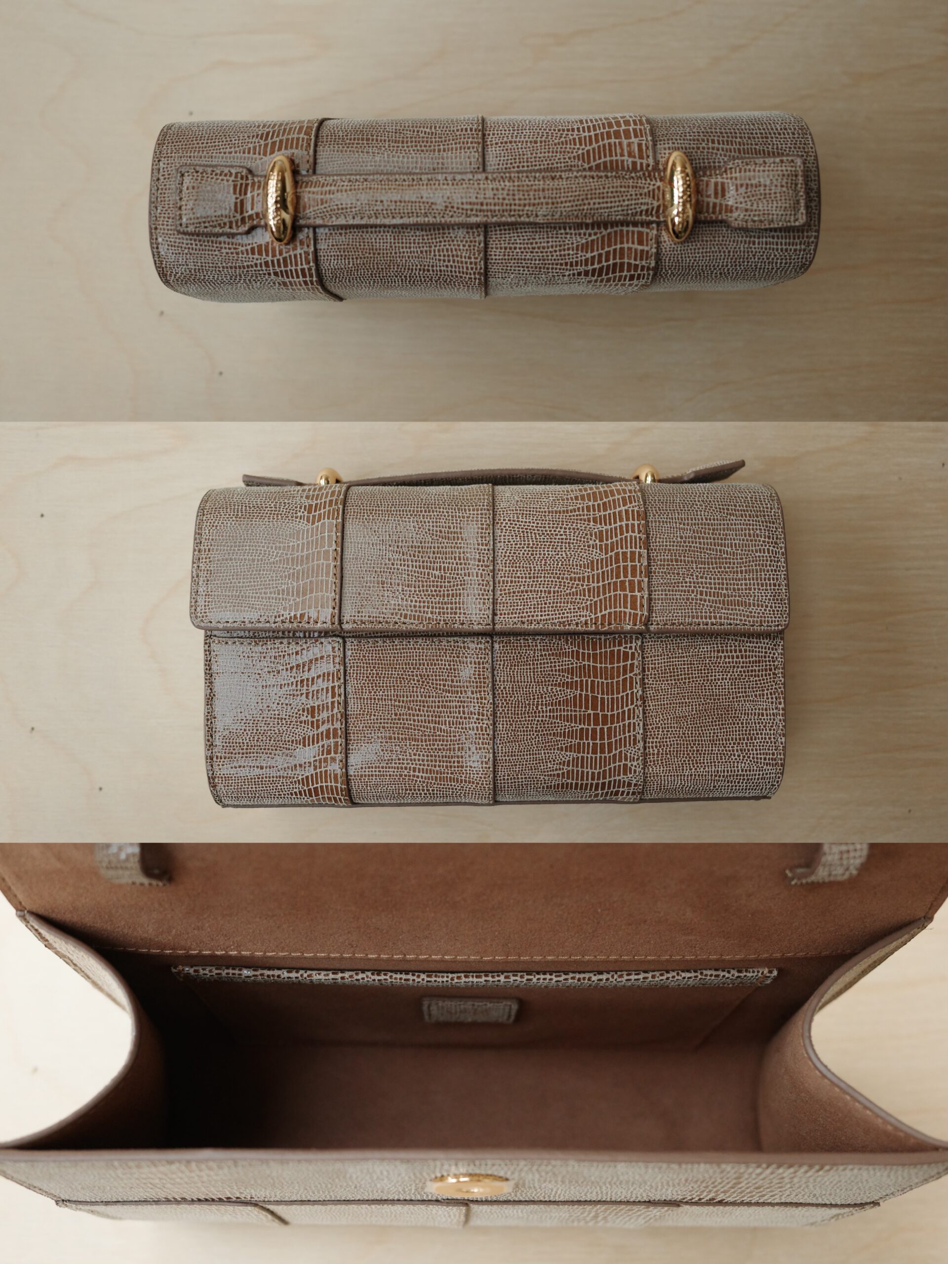 A sculptural expression of Mynte’s signature stripe pattern, elevated through clean lines, bold form, and timeless restraint. Meticulously crafted from Italian suede leather, delicately embossed with a refined lizard print, this edition highlights a rare technique that brings depth and character to the surface.